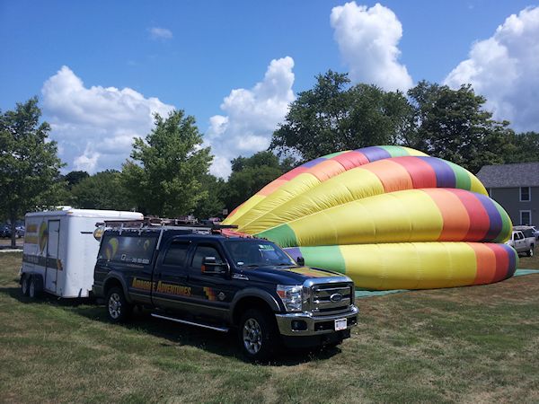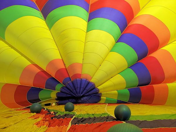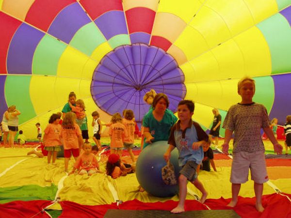 A balloon walk consists of a hot air balloon (not the same one I fly) that is in anchored at the top end, and at the bottom end, and then inflated with cold air by use of an inflation fan. Rather than standing the balloon with air that is heated by the burner, the balloon is kept inflated with just the cold air. A large heavy mat is placed over the 'skirt' at the bottom end of the balloon, making it easily accessible for children of all ages, including those in wheelchairs. The public can then enter and view the balloon from the inside (without shoes). To make the experience even more fun for children, we typically introduce large inflatable balls for them to play with while they are in the balloon.